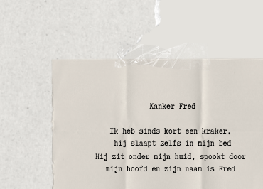 Wanneer ik met een psycholoog bespreek dat ik word verteerd door schuldgevoel dat ik mijn kinderen ga verlaten drukt hij me op het hart dat mij dit ook overkomt. Hij adviseert me met klem om de kanker los van mezelf te zien. Wat een onmogelijke suggestie lijkt leidt een aantal weken later toch tot het eerste gedicht van deze bundel: Kanker Fred. "Ik heb sinds kort een kraker en zijn naam is Fred."